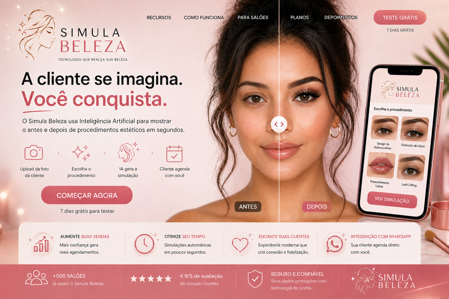 O SIMULABELEZA transforma o link do seu salão em uma experiência beauty tech premium: a cliente escolhe o procedimento, envia uma foto, visualiza a transformação e agenda com você.